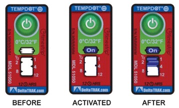 TempDot™Plus標(biāo)簽應(yīng)存儲(chǔ)在室溫下,并必須在反應(yīng)溫度閾值以上被激活。激活是通過用手指推壓。"On"字出現(xiàn)在第一個(gè)窗口中顯示激活。之后5分 鐘內(nèi),在反應(yīng)溫度或低于反應(yīng)溫度的情況下將標(biāo)簽貼到產(chǎn)品上。藍(lán)色染料熔化并以控制的速率遷移,經(jīng)過白色大窗口。這表示暴露在溫度閾值以上的累計(jì)時(shí)間。當(dāng)溫 度低于閾值時(shí),該染料固化并停止移動(dòng)。如果溫度超過閾值,TempDot®Plus標(biāo)簽提供即時(shí)的視覺跡象。